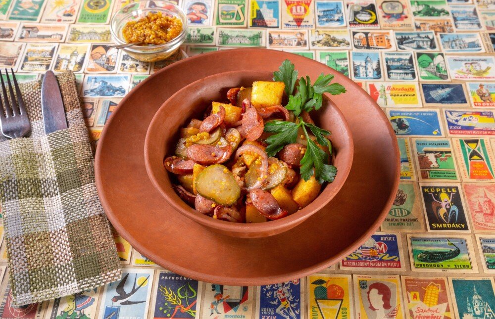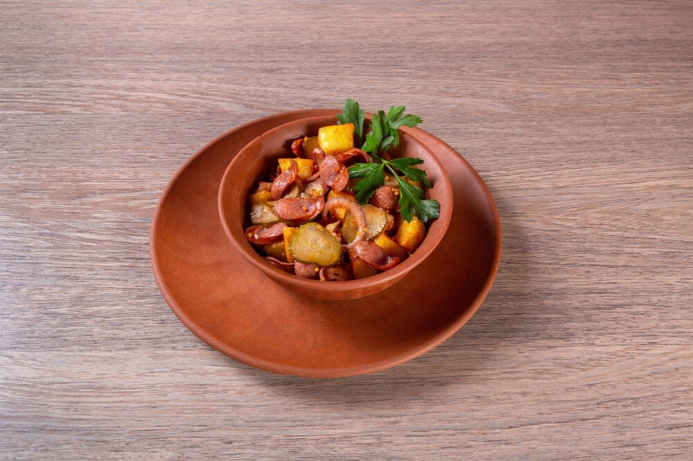 ОБжаренный картофель, охотничьи колбаски, красный лук, бекон и масляно - горчичная заправка.
