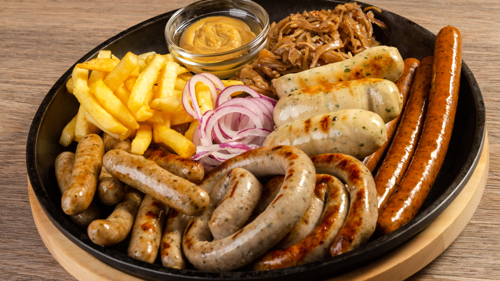 Натуральные мясные жареные колбаски (баварские, франконские, венгерские, мюнхенские), подаются с картофелем фри, жареной квашеной капустой, маринованным луком и острой горчицей