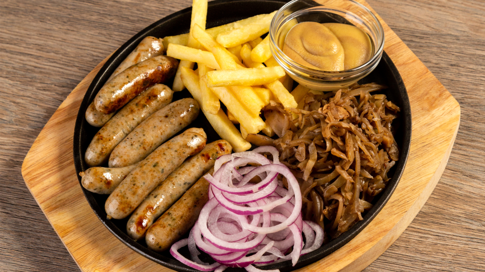 Маленькие свиные колбаски в натуральной оболочке с душистыми специями и майораном. Подаются с картофелем фри, квашеной капустой по-баварски, маринованным луком и горчицей