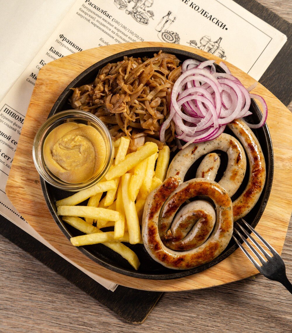 Скрученные спиралью свиные колбаски в натуральной оболочке с душистыми специями и майораном.подаются с картофелем фри, квашеной капустой по-баварски, маринованным луком и горчицей