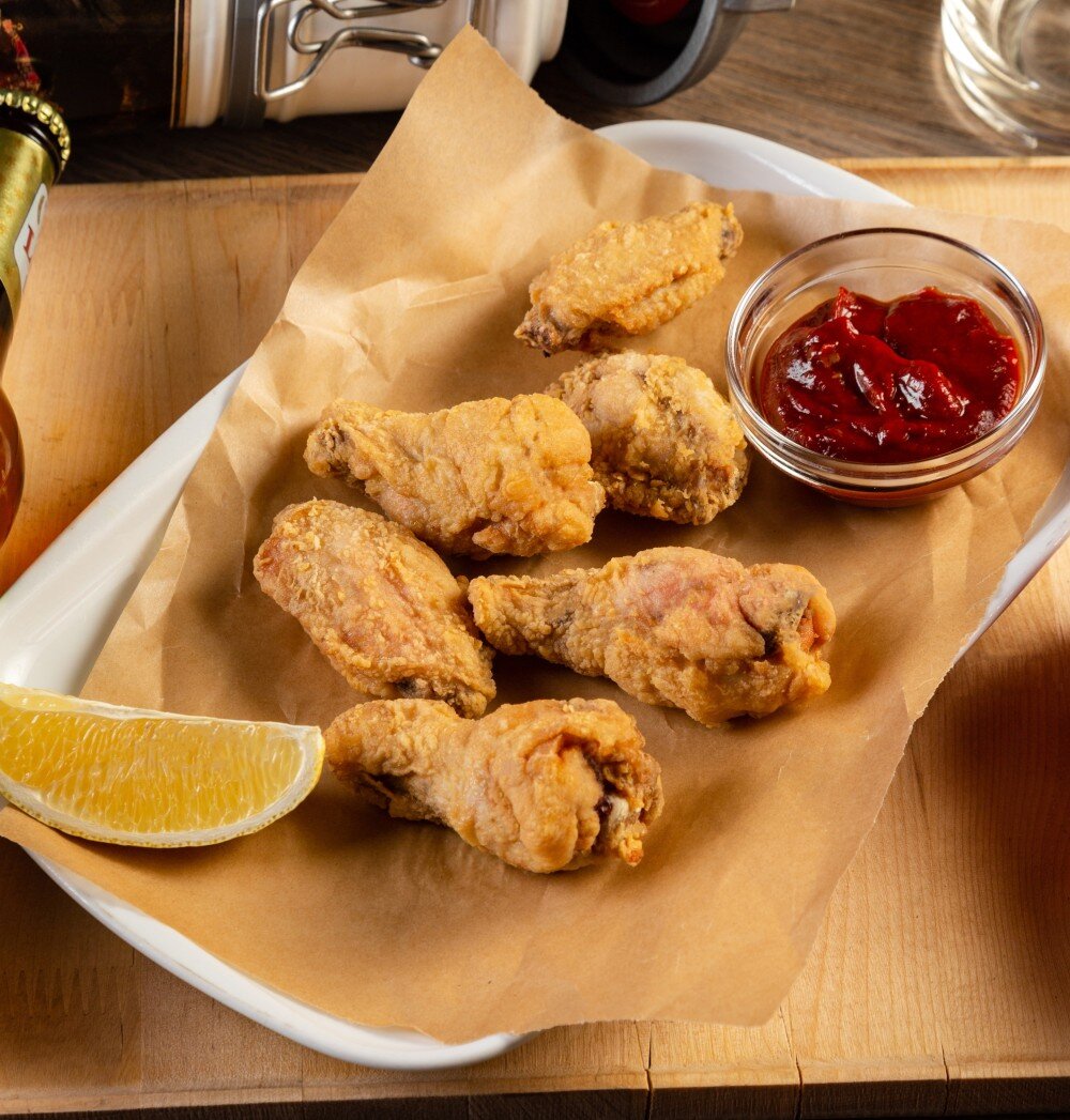 Куриные крылья, жареные во фритюре. Подаются с соусом барбекю