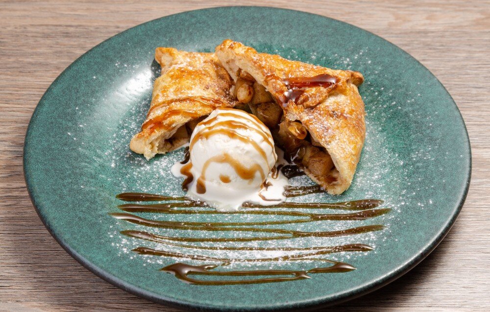 Яблоки с изюмом, запечённые в слоеном тесте, подаются с шариком мороженого и сливочно-карамельным соусом