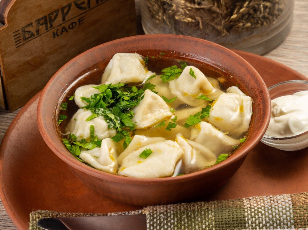 Натуральные мясные пельмени, подаются в бульоне со сметаной