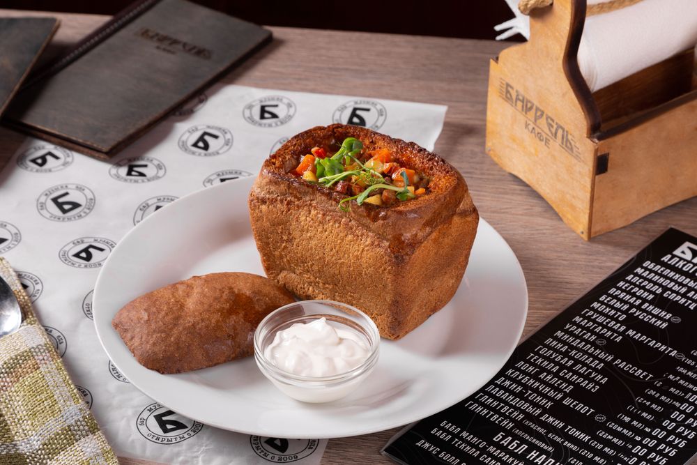 Фирменный суп-гуляш «Баррель» в буханочке хлеба