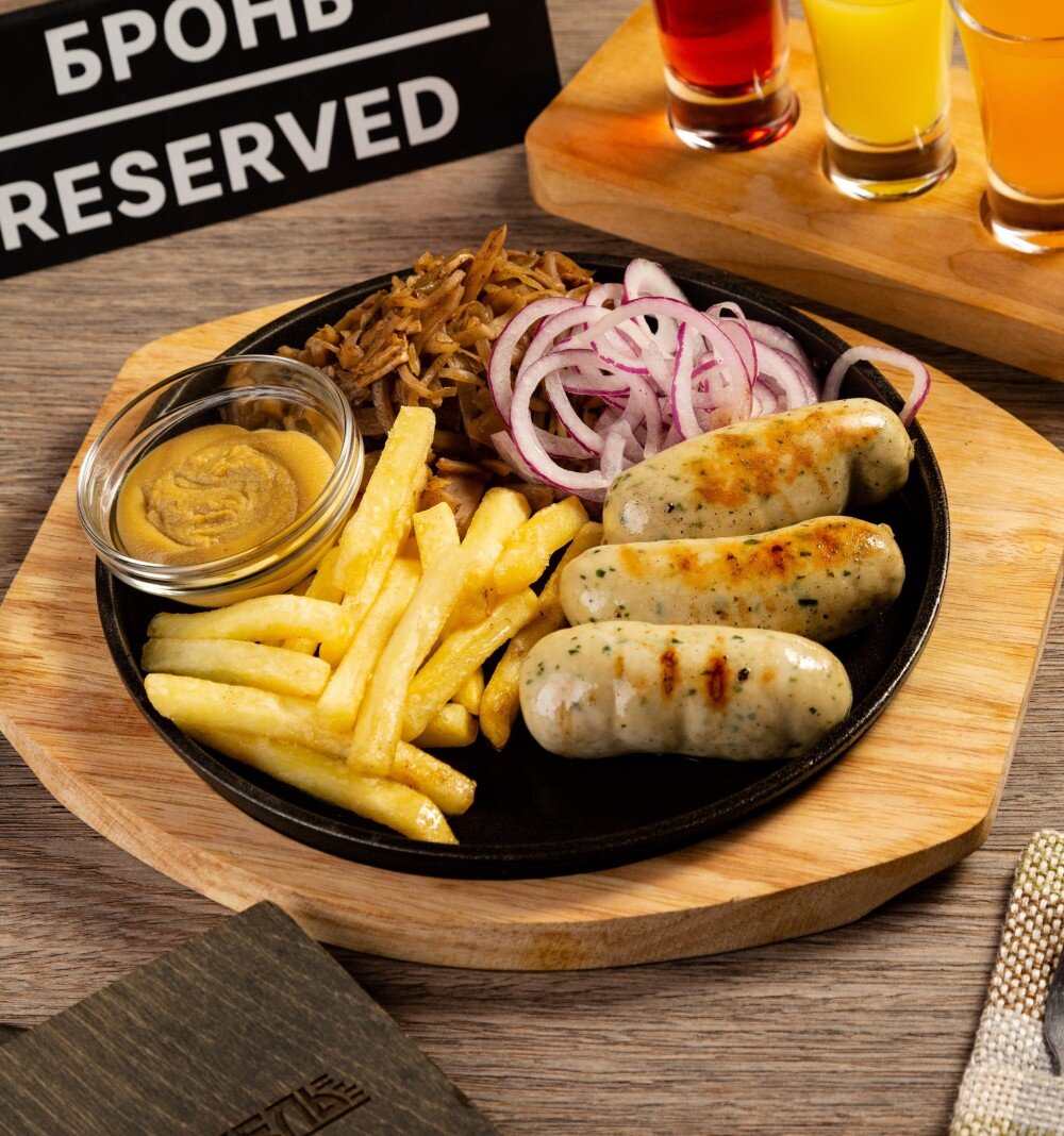 Свиные колбаски в натуральной оболочке с добавлением пряных трав и специй. Подаются с картофелем фри, квашеной капустой по-баварски, маринованным луком и горчицей