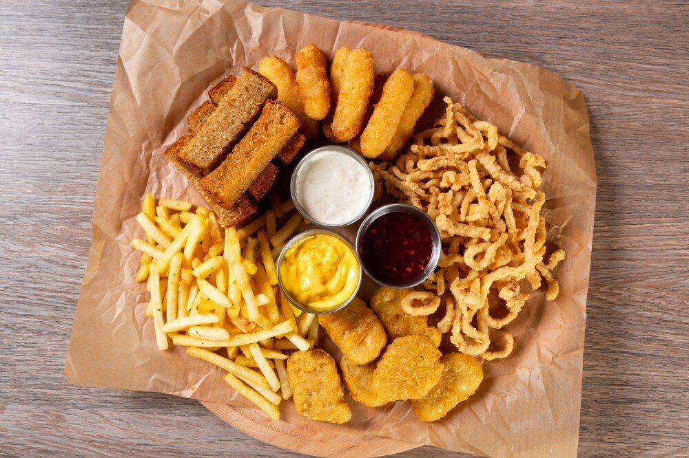 Гренки чесночные, кальмары в хрустящей панировке, сырные палочки, наггетсы куриные, картофель фри, соус Тар-тар, сырный соус, соус сладкий Чили.