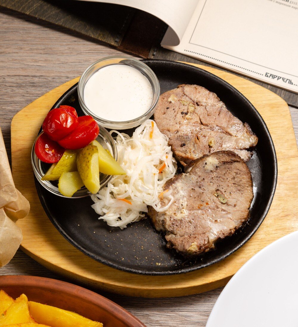 Шея свиная запеченная с чесноком, картофель печеный, корнишоны, томаты Черри маринованные, капуста квашеная, соус сливочный с хреном.