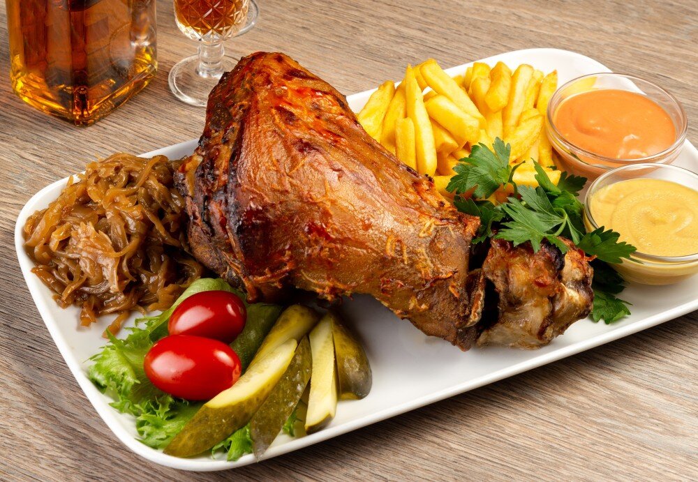 Свиная рулька, маринованная в соевом соусе с набором трав и специй, запеченная под сладким горчично-чесночным соусом. Подается с картофелем фри. кетчупом, горчицей, жареной квашеной капустой и соленьями.