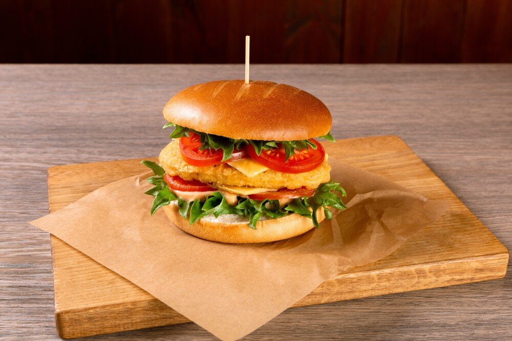 Острый куриный бургер c томатами и сыром