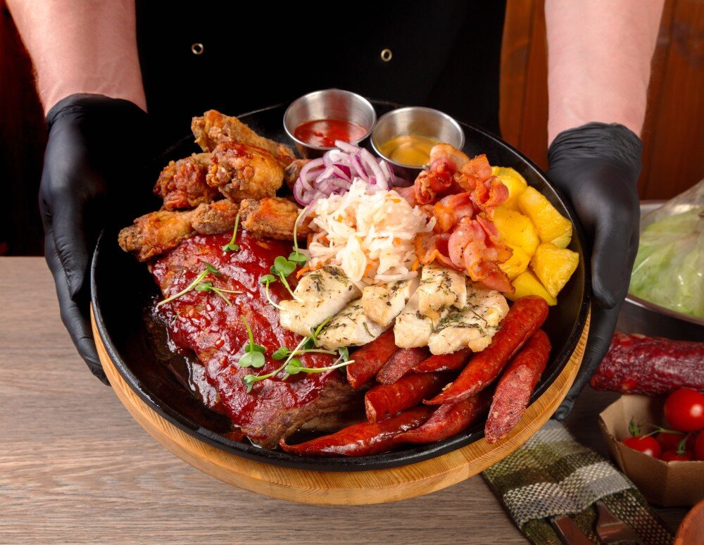 Ребрышки свиные, крылья куриные, бекон фри, колбаски охотничьи, куриная грудка гриль, картофель печеный,капуста маринованная, лук маринованный, соус томатный