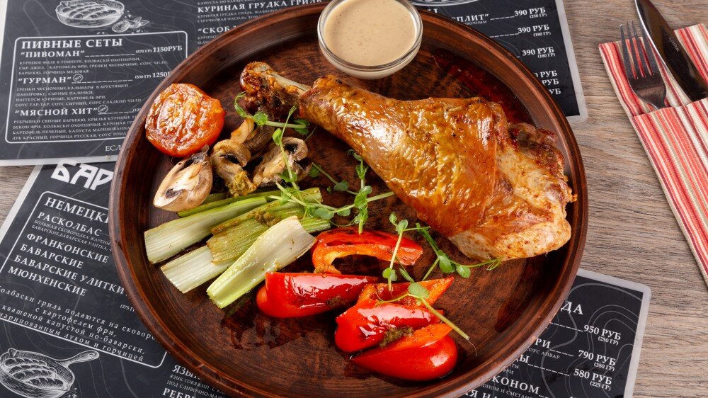 Ножка индейки с овощами и ореховым соусом