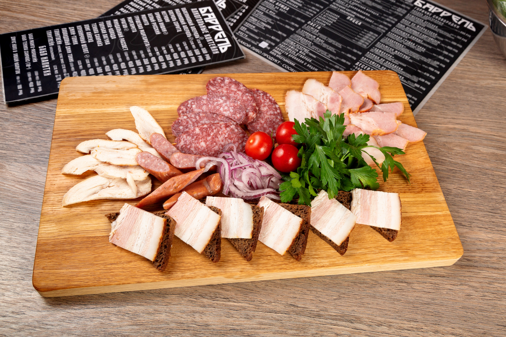 Бекон, колбаса сыровяленая, куриная грудка варено-копченая, колбаски "Дачные", корейка свиная копченая, хлеб Бородинский, шпик чесночный, лук красный.