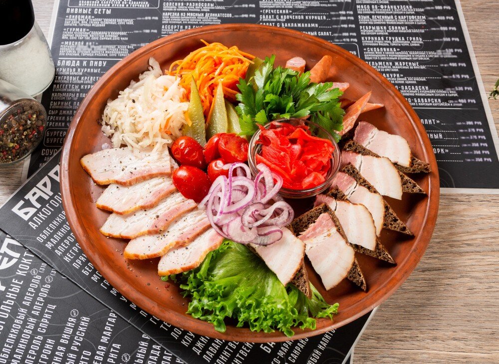 Колбаски баварские, мясные копчености, маринованные корнишоны, маринованные томаты Черри, квашеная капуста, имбирь, салат листовой, хлеб бородинский, шпик закусочный.