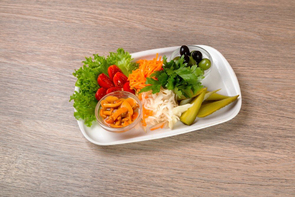Маринованные: корнишоны, помидоры, грибочки, квашеная капуста, морковь по-корейски, маслины, оливки.