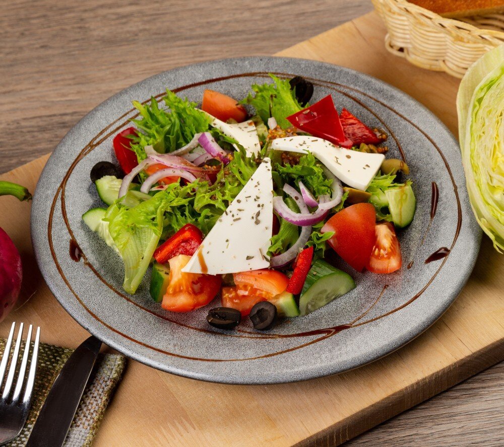 Классический салат из свежих овощей, сыра Фета, листьев салата, маслин и оливок, заправленный оливковым маслом, зернистой горчицей, бальзамическим уксусом и специями