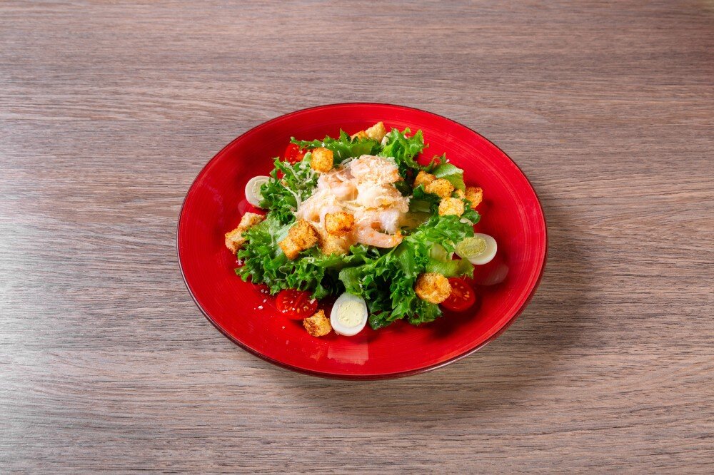 Тигровые креветки,пекинская капуста, салат айсберг, сухари, томаты черри, перепелиные яйца и сыр пармезан под соусом цезарь