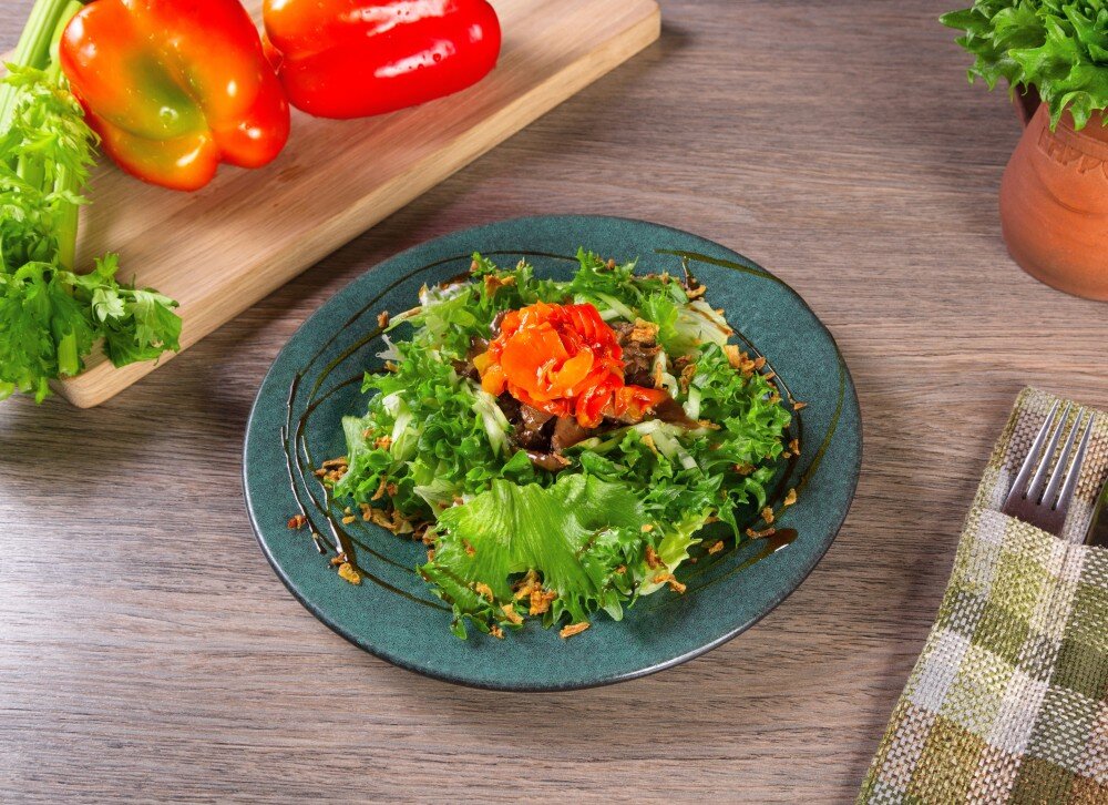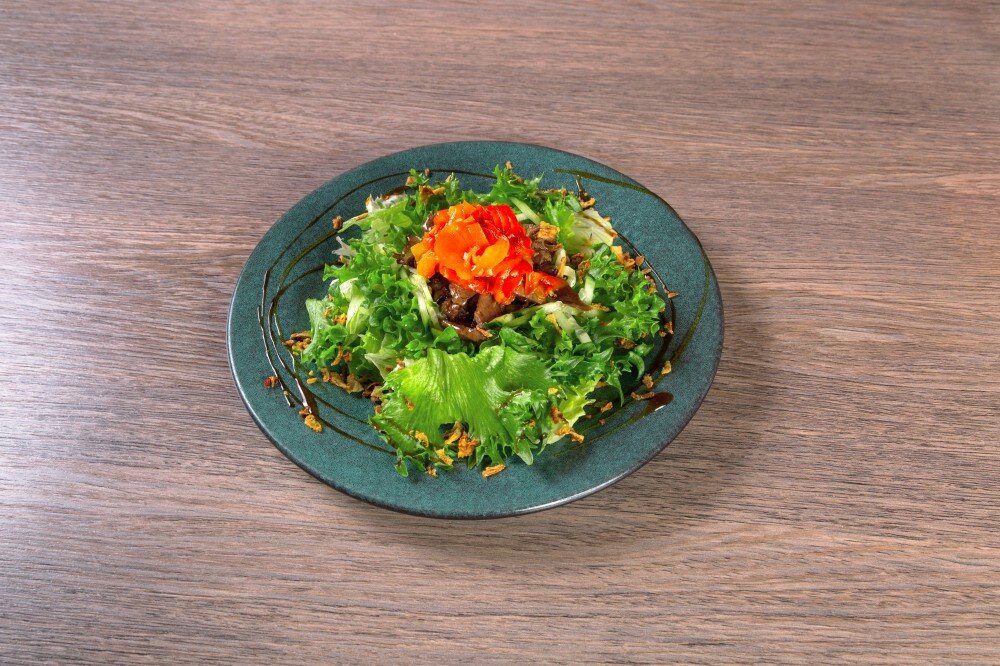 Кусочки обжаренной говядины, яйцо куриное, листья салата, пекинская капуста, свежий огурец, печеный болгарский перец, лук фри, заправленный соусом терияки с майонезом